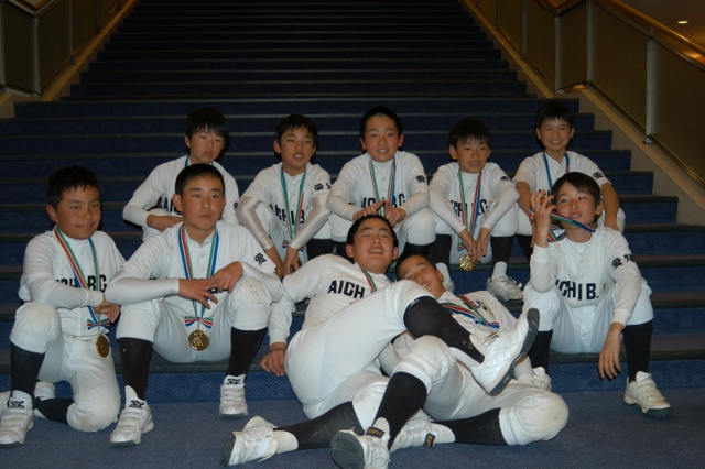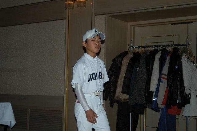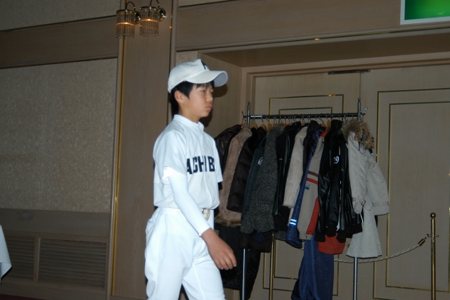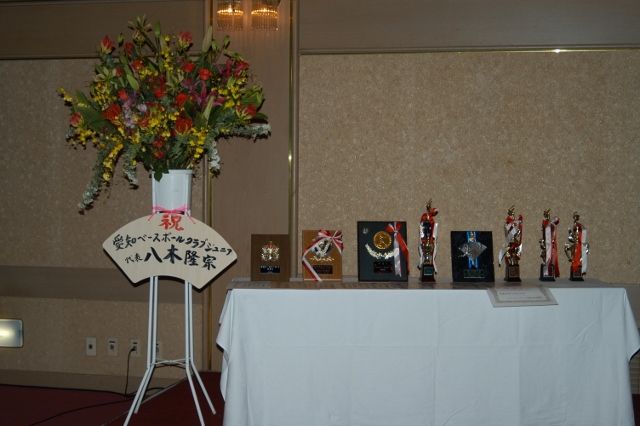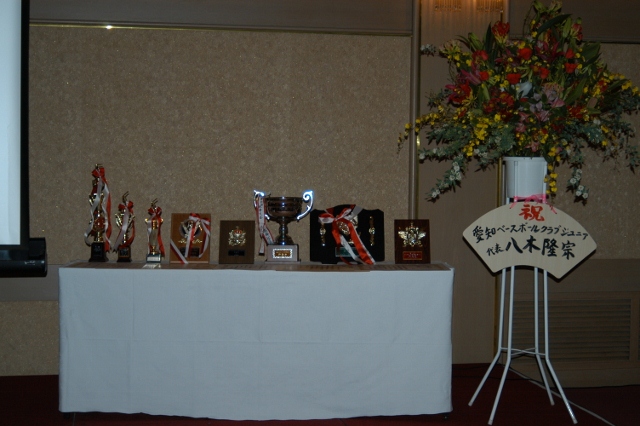 式の前に記念撮影 たくさんのトロフィーと盾